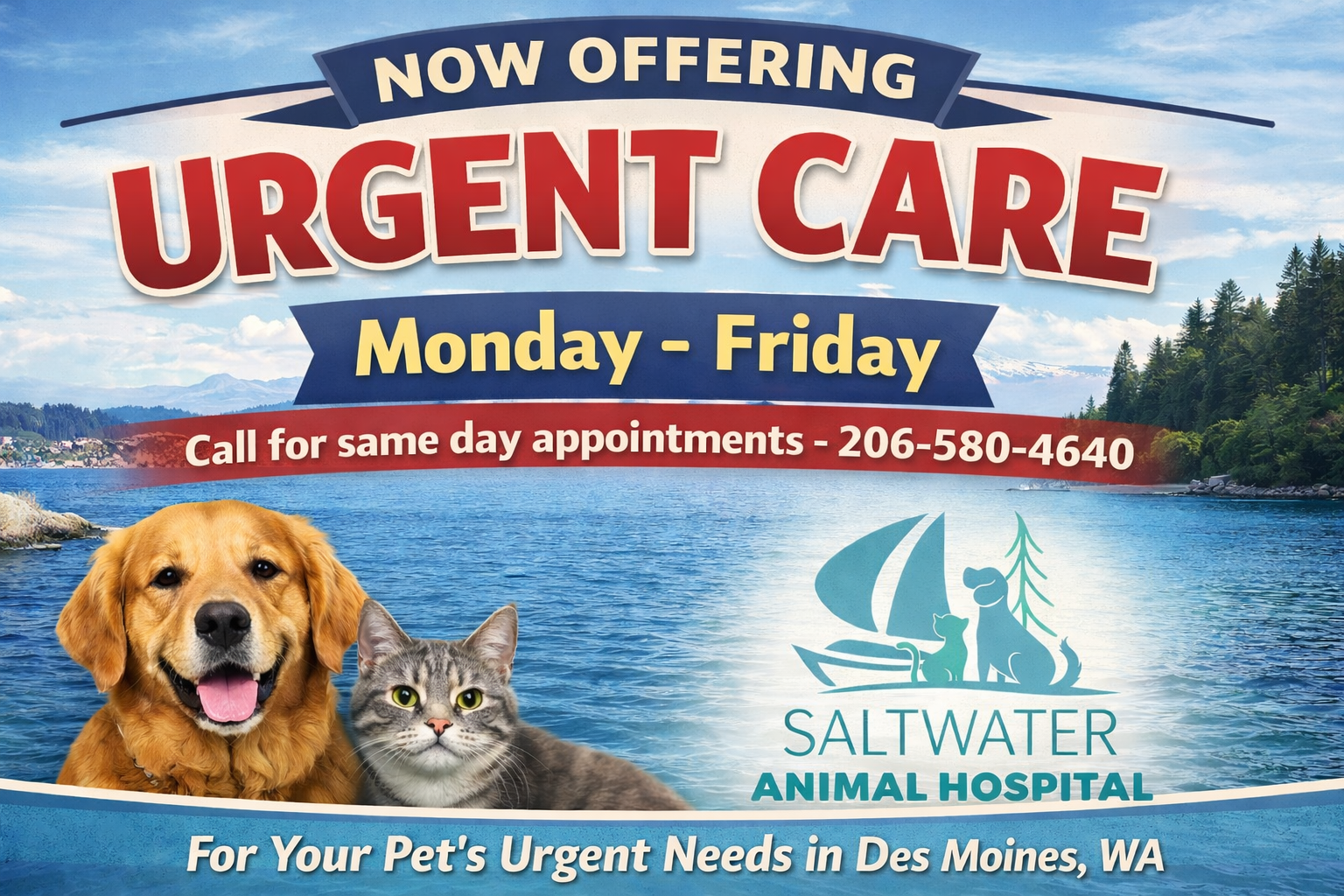 We also have a very convenient location. If you’re looking for a Burien Vet in Des Moines, look no further than our clinic. When you drive up to Saltwater Animal Hospital, you’ll spot our sign outside. As soon as you walk through the door, our team will be happy to see you – and your furry friend, of course!